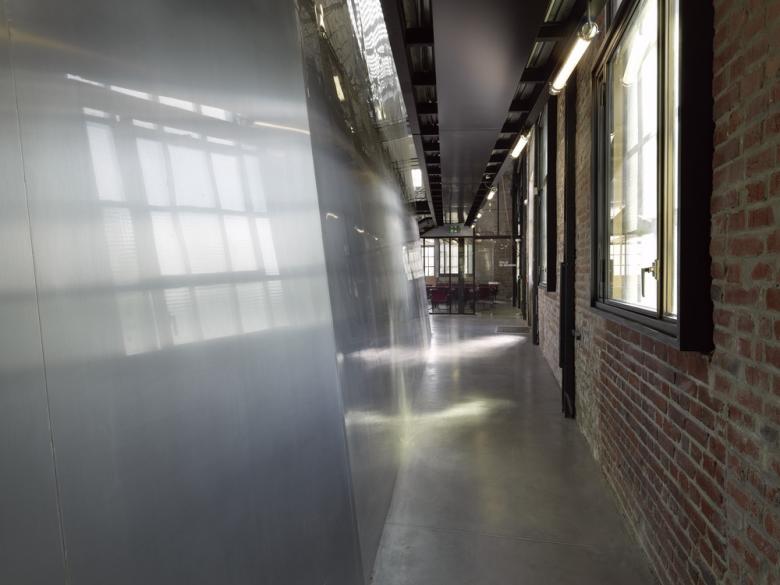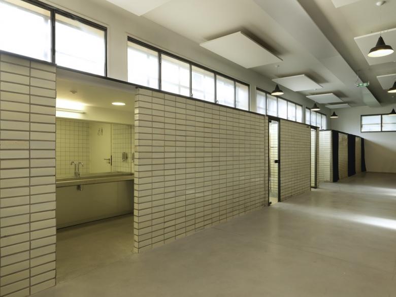 Architectural components such as the metal structures, gantry cranes, the pulley system and technical grid in the nave, the brick walls, etc., have been retained and enhanced. Some original wall and floor tiles (cement tiles) have been restored. The water green colour of the nave walls, the so-called “hygiene green” commonly used in the first half of the 20th century in buildings linked with industry and health, has been restored.