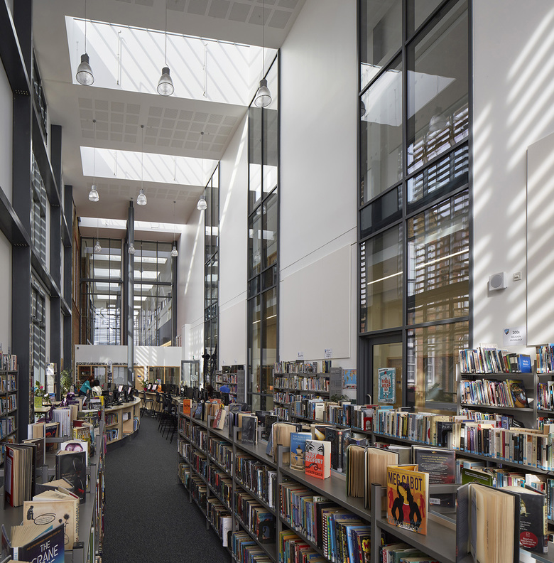 At the heart of the school is the Arcade, a triple-height circulation space linking new and existing elements of the campus. The Arcade is the main focus of the school and provides the new main entrance. "Flipping" the entrance from Charrington Street to Chalton Street is one of the major achievements of the design, which effectively reorients how the school relates to its surroundings and how staff, students and visitors approach the school.