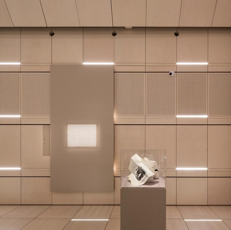 A precious jewel case clad in clear stained beech wood panels, the exhibition gallery possesses all the accessories required for presenting art works. The refined interior contrasts with the agricultural building housing it, a simple parallelepiped built in rubble masonry with randomly placed openings. Its aesthetic value grows out of its opposition. The use of wood in this project recalls the architects' previous intervention on the abbey church and contributes to the abbey’s visual continuity.