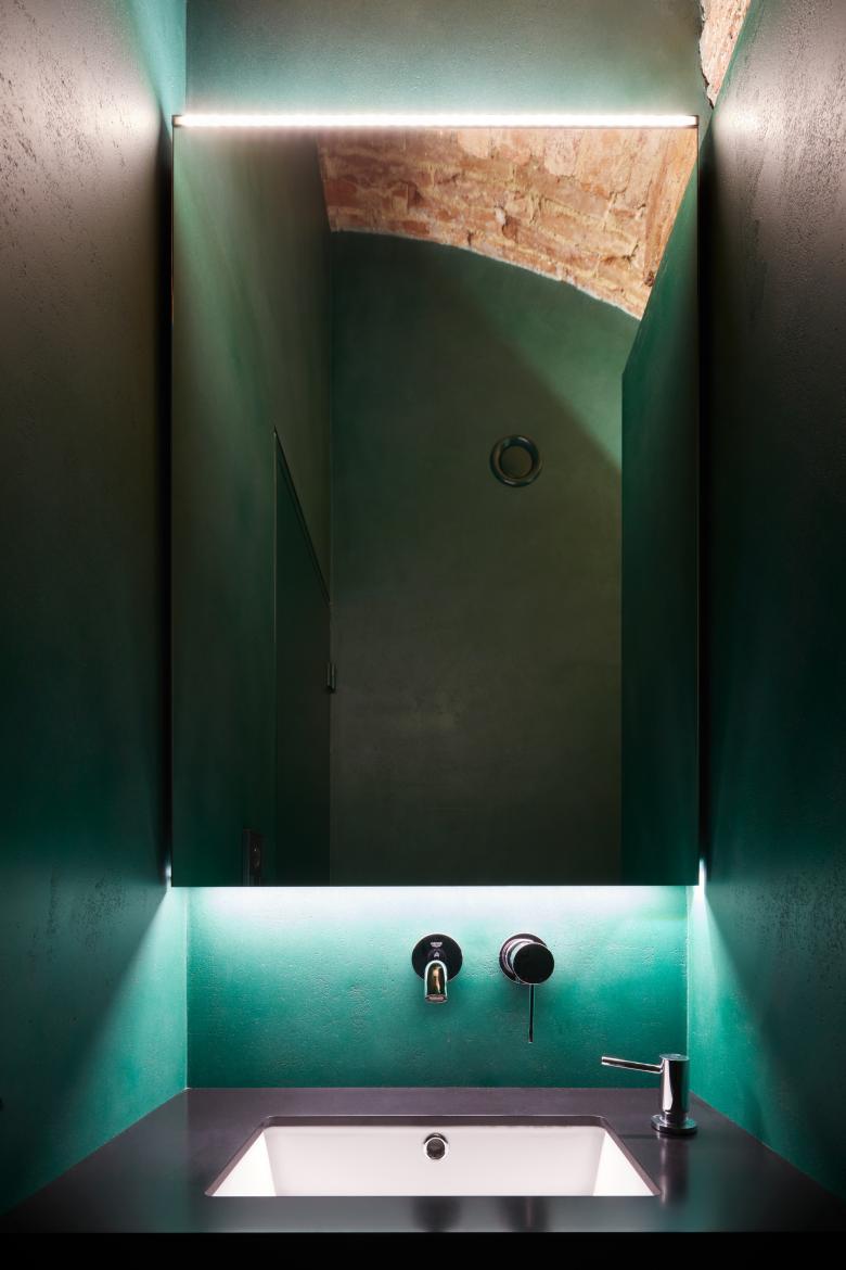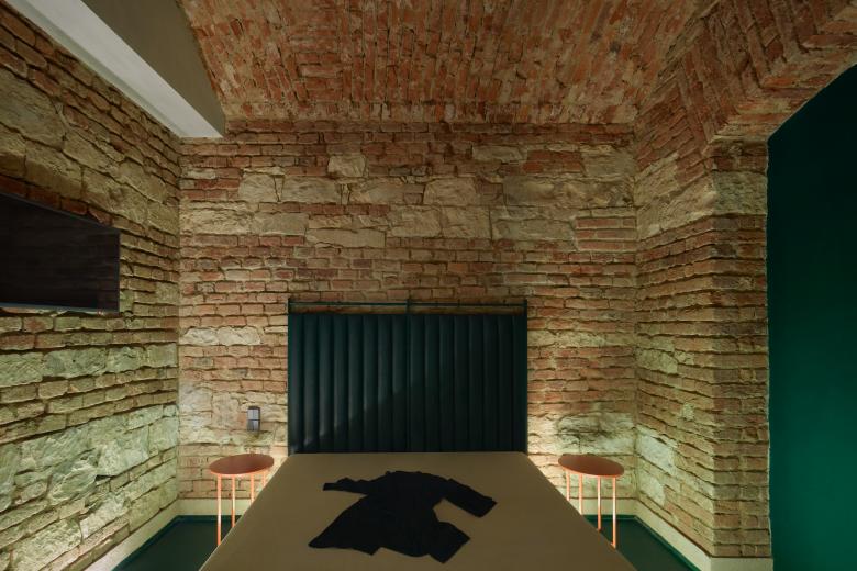 The approach was to create a world of its own, with a bit mysterious, slightly bizarre yet still elegant and most of all intimate mood. The interior is inspired by the aesthetics of David Lynch movies, the main corridor makes a tribute to a scene from Under the Skin. Intimacy is supported by the play with lighting effects. The rough masonry is contrasted by a minimalistic treatment of all the new surfaces that are united by a single color. To emphasize a "luxury" feeling, there is also an additional decorative surface, almost at the edge of a kitsch – which doesn‘t matter in this case...