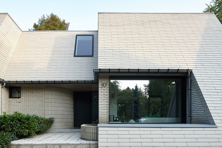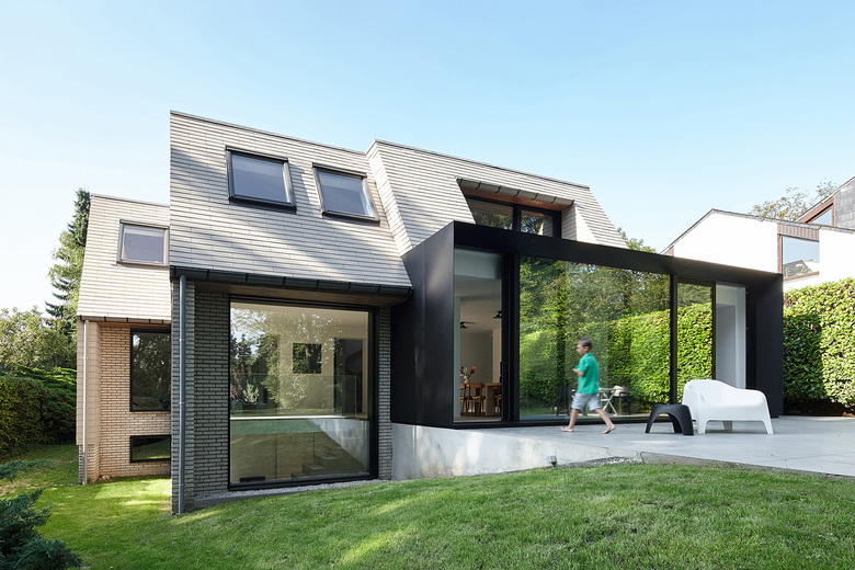 While respecting the existing volume, the architects wanted to improve it by modifying the dimensions of some windows and reducing the heaviness of the roof. To achieve this, they used shaded slates with dimensions similar to the existing bricks. These bricks were kept. This gives a new coherence to the house by reducing the feeling of juxtaposition of two separate volumes (the roof and the base). The continuity of lines between the different sides of the roofs was achieved thanks to the collaboration with the roofers.