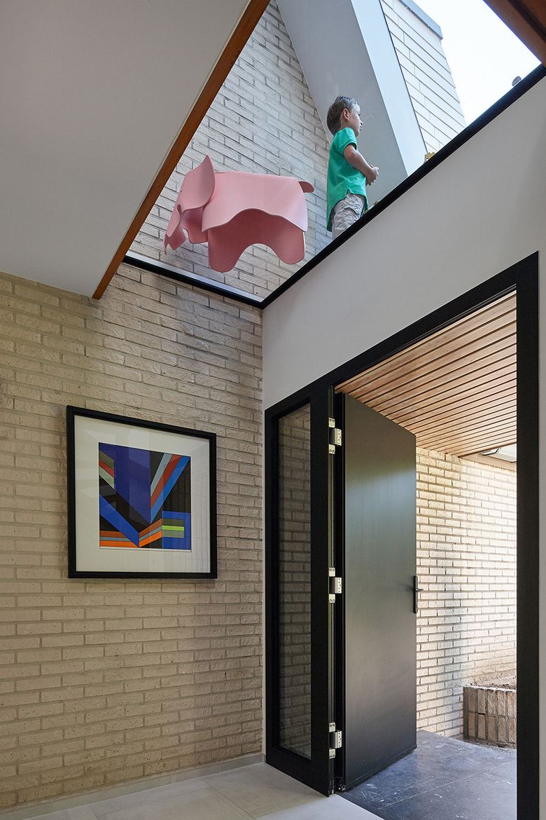 The façade being rather closed, the lobby and upstairs hallway were relatively dark. To overcome this, the architects suggested to set up a new roof window above the lobby. This allows to open a view from the upstairs hallway but also to bring light to the lobby through the glazed ground. This also creates a fun visual link between the two levels and divide them both in terms of acoustics and temperatures.