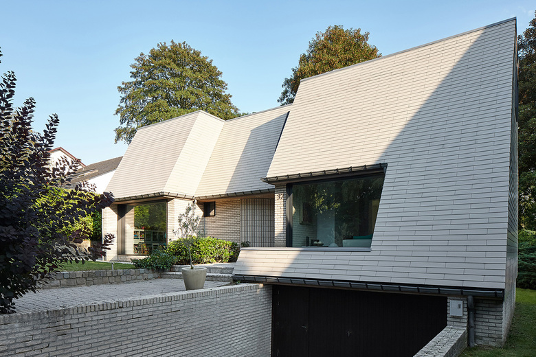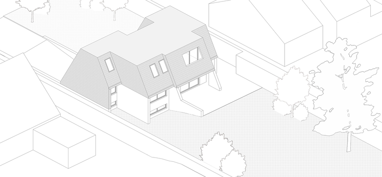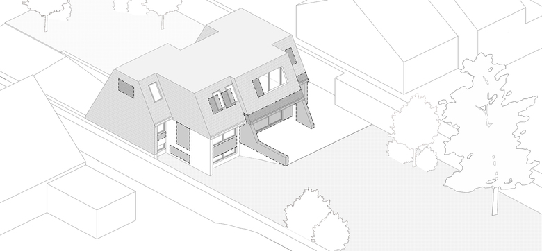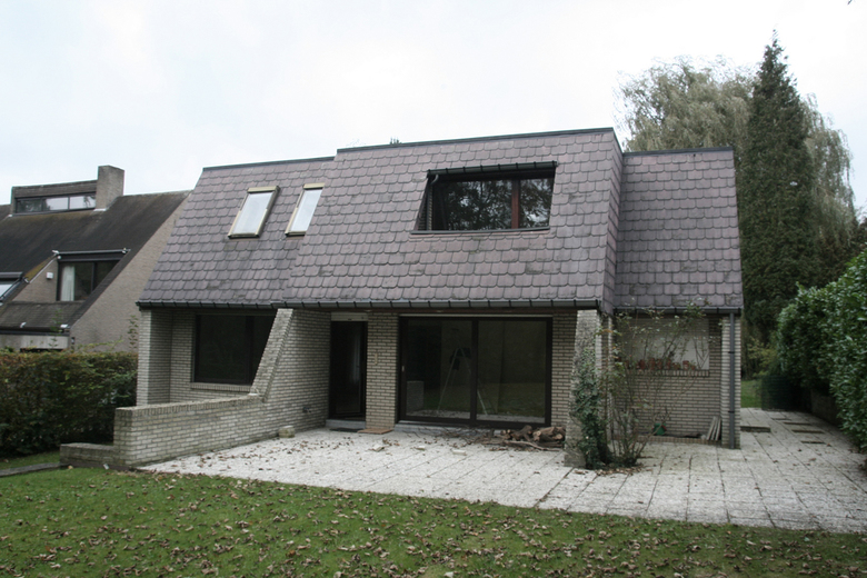 With its rather old-fashioned architecture, the house is characterized by a visually heavy slate roof. Over the years, the artificial black slates gradually took a pink hue which is not in harmony with the bricks of the ground floor. The eaves, the size of the windows and the materials make for a particularly dark interior which lacks opening on the large tree-filled garden.