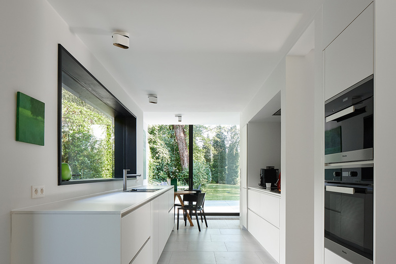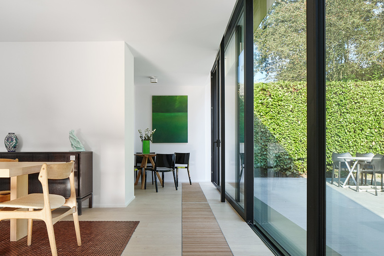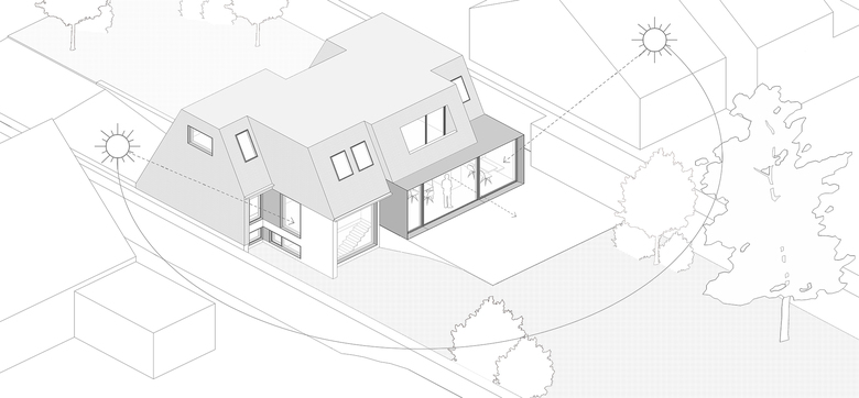 The intention of the architects was naturally to build large windows on the back of the house (opening on the garden) as well as on the side façades. The new extension on the back is largely glazed and opens on the long garden. The large side windows that have been opened allow to track the sun's path and to take advantage of the natural light throughout the day.