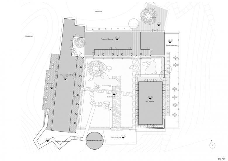 Beside the south side of inner yard—the entrance of the original primary school—the western half of enclosure has been dismantled; the eastern ceramic tile mark with time trace has been reserved. In this way, the mottled water tower will be thoroughly presented and become an indispensable scenery element in inner yard.