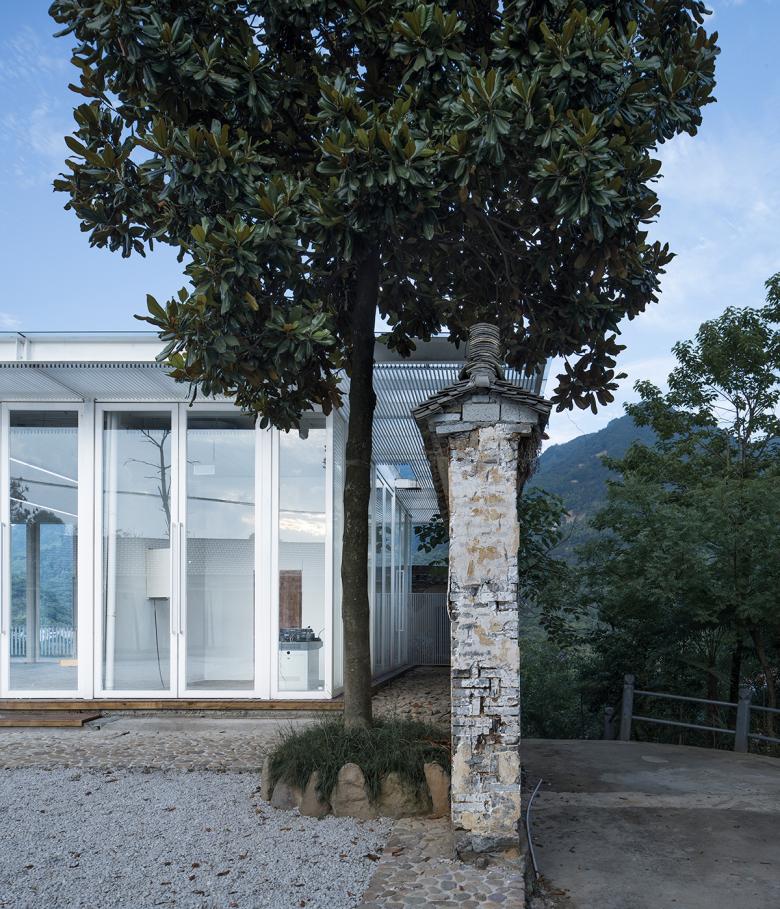 Under the new wooden framework, in the dim and transparent glass box, under eave and on the platform, you can see the mottled walls with memory and the words with story and look far into the mountains and the sun… Memory appears; scene appears; and then poetry appears.
