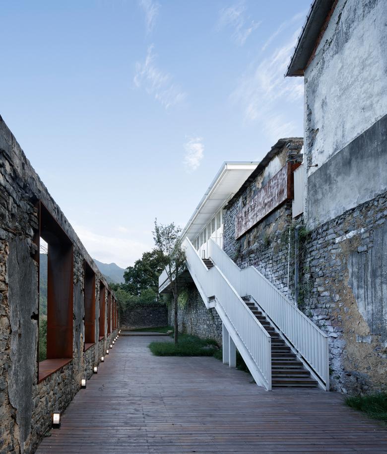 In the east of the new house, there is an outdoor platform which is lower than the house. A stone enclosure surrounds it. A row of one-story houses may exist but their roof is lost. There are many holes on stone walls. Although the holes are not complete, the remote scenery can be felt. We use rectangular modern rusty boards to add a row of frameworks of scenery. When you view from the inside to the outside, you can feel strong sense of integration and design from the natural, modern and historical substances.
