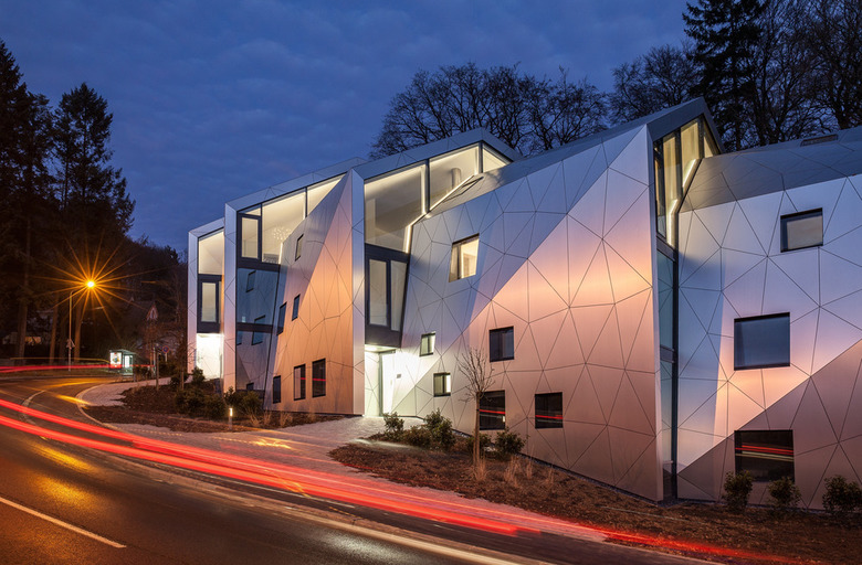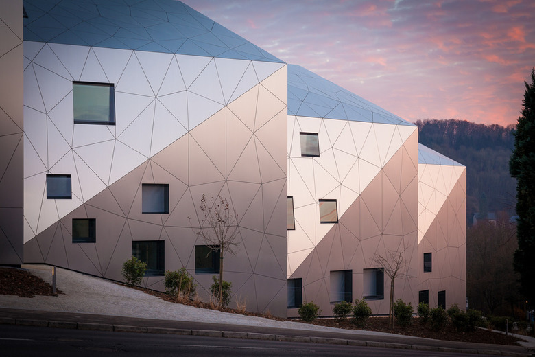 The building is made of a massive structure of reinforced concrete, faced with a ventilated facade made of triangular aluminium panels. The thermal insulation of the walls consists of mineral fibre. The openings are filled with three-layered glass in an aluminium frame. The large glass elements are specially coated with anti-UV film to prevent the building from overheating.