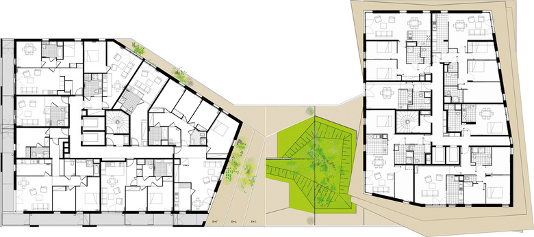 Many people aspire to live in suburban style, individual housing. There are many reasons for this, but in particular being able to create a true identity for one’s own home. Secondly there’s appeal of eating outside, having direct contact with the outdoors from the comfort of your own house, while owning one's own land. These desires must be integrated in to the scale of the apartments in a collective building. The architects have responded to this search for individual identity, ownership and differentiation by creating multiple exterior spaces and apartments with various, differing typologies within the collective.