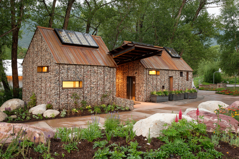 The available site required that the building be threaded between a pedestrian pathway and amongst an old stand of Cottonwood trees. The small footprint of the building along with its clean simple gabled form is harmonious in scale to the adjacent buildings and landforms in this area of the park. The building’s design incorporates familiar forms, low maintenance native materials and a color palette intended to blend with the environment. The building’s exterior skin is a Gabion wire crib filled with river rock obtained on-site from the ongoing stormwater pond redevelopment, while the simple gable & shed roofs are of rusted steel reminiscent of Aspen’s mining heritage. Hot rolled steel plate surrounds case the windows and doors allowing deep recessed openings. In response to the city's “Canary Initiative” against climate change, numerous sustainable design features have been integrated into the building’s design, including a greywater garden, composting toilets, daylight & occupancy sensors and a BIPV skylight, which will provide ample day lighting for the majority of the year. Interpretive panels on the building’s exterior will highlight the sustainable attributes and provide educational material about the surrounding area’s history and current redevelopment.