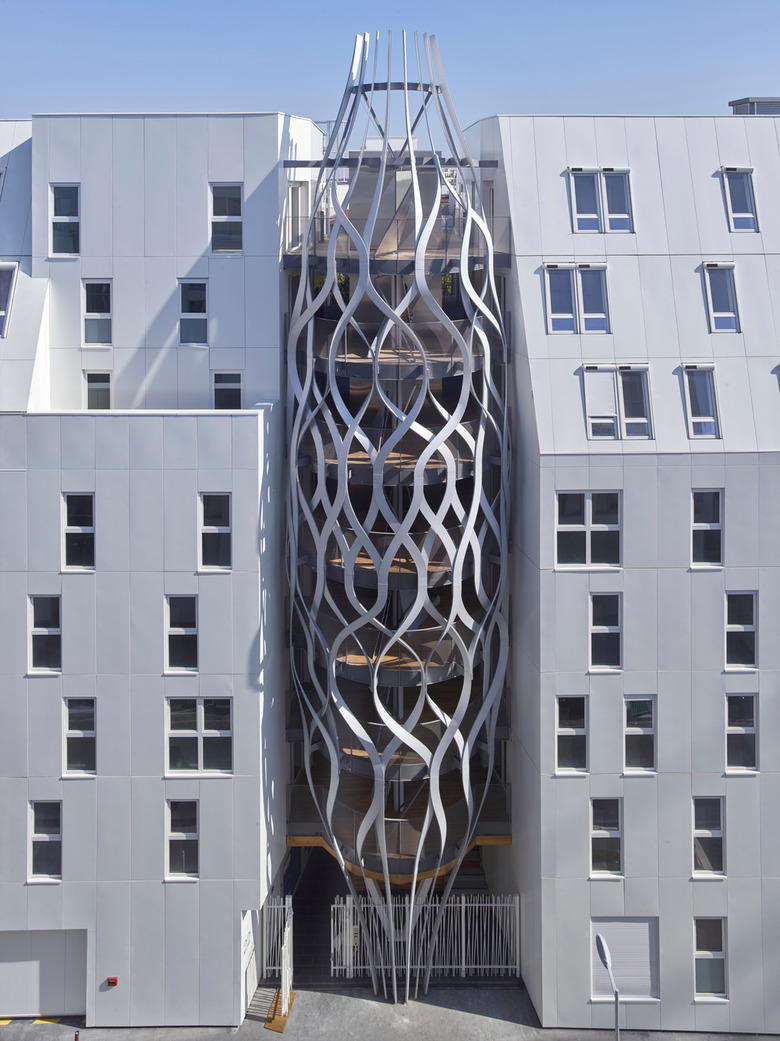 Their simplicity is underlined by an extravagant feature: between these spaces, broken up by fault lines, are a modern twist on the classical loggia. They take the form of an intricate mesh, combining vertical passages providing access to four apartments on each floor and one entrance/loggia per apartment. These towers are totems for the whole district, showing the importance of private outdoor space in the modern city by making them spectacular and fun.