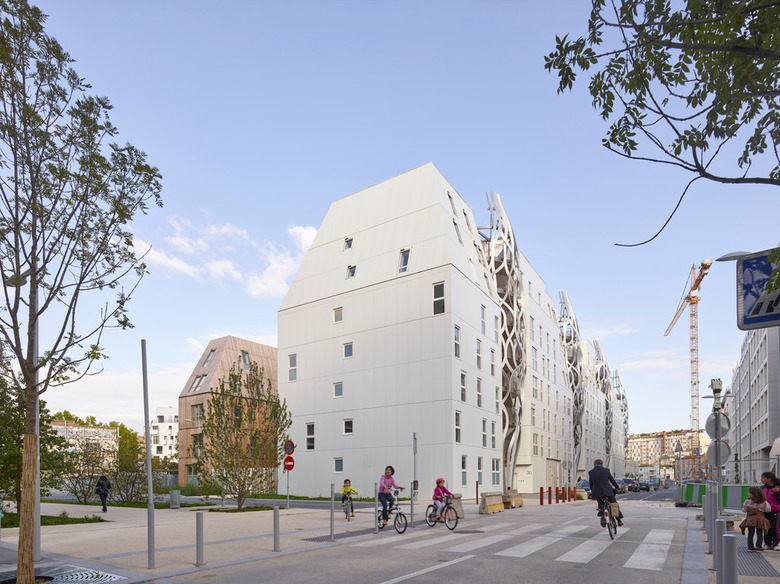 Behind this frontage, where it joins the future secondary school for plot A, there is another reference to the urbanism of Paris and this part of the city in particular: the private road, lined with family homes or the residential centre of the plot. Here, there are fifteen properties in an apartment block built over three storeys, plus lofts, offering a more secluded, quieter urban environment, enlivened by external loggia-type extensions which are partially open and private, with the spaces between them intricate wooden cladding which mirrors the cycle of light and shade throughout the day.