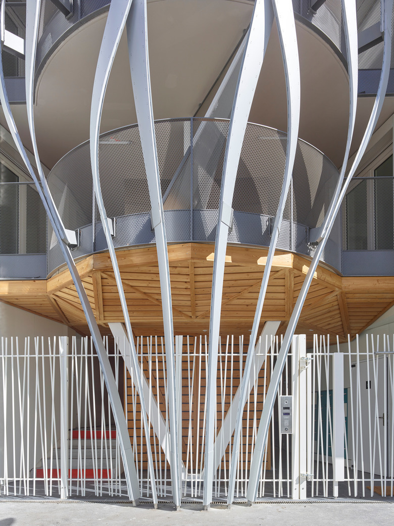 As in the suburb of Plessis-Robinson and the little residential huts among the trees of the outdoor guinguette cafés of the early 20th century, you are brought back home by what has inevitably become the stand-out feature of the building. The unusual identity provided by these entrances/loggias which ensure privacy for their residents is achieved through the use of interwoven riveted aluminium: the softness of form, constructional strength and quality of the anodised metal: a number of allusions to the industrial history of the area without becoming mired in nostalgic reminiscence. The pure and simple joy of living here is revealed by the simplicity and quality of the building.