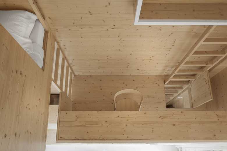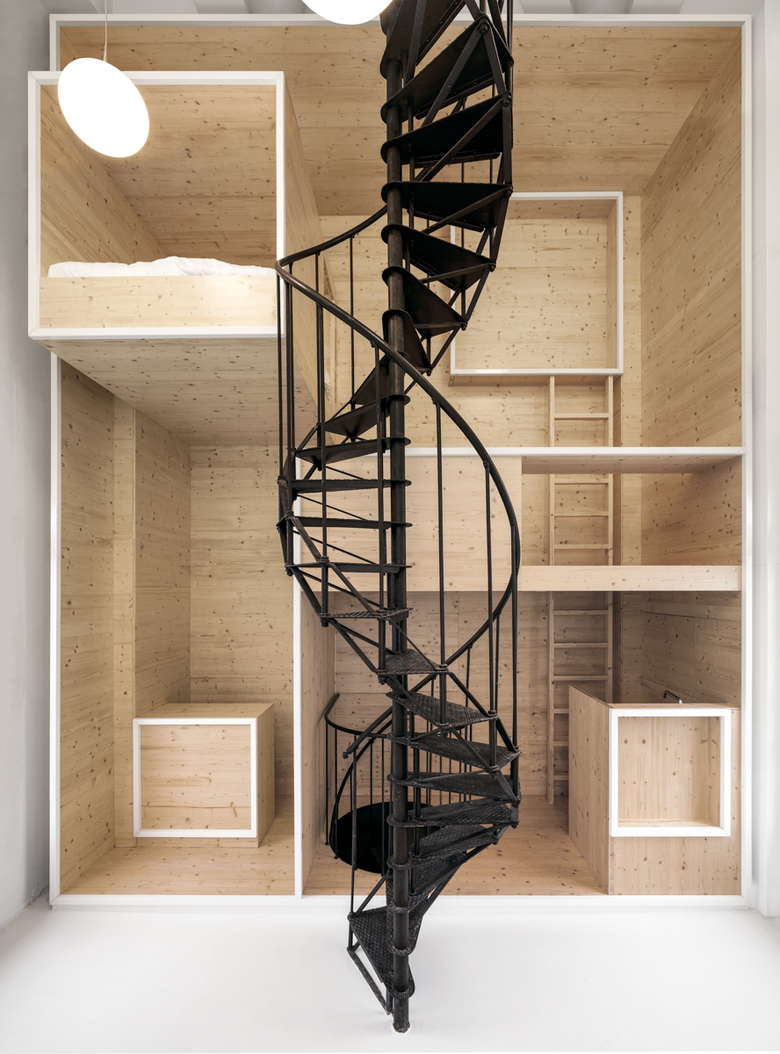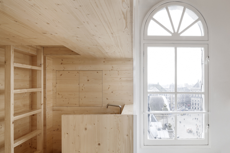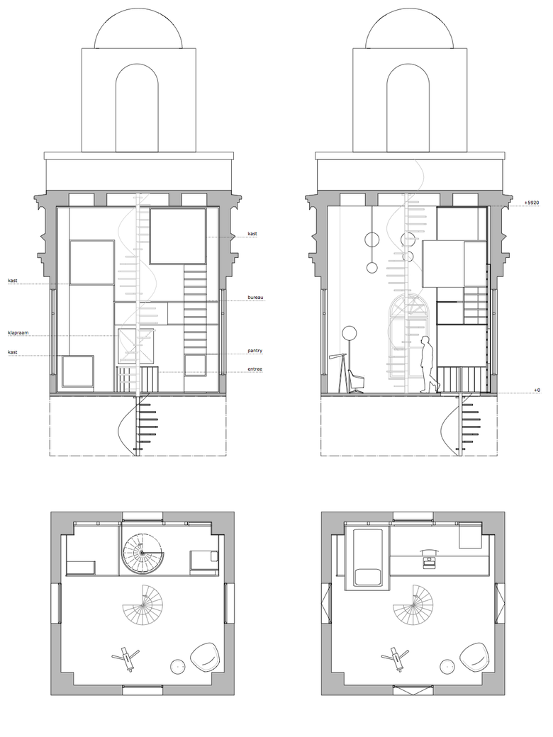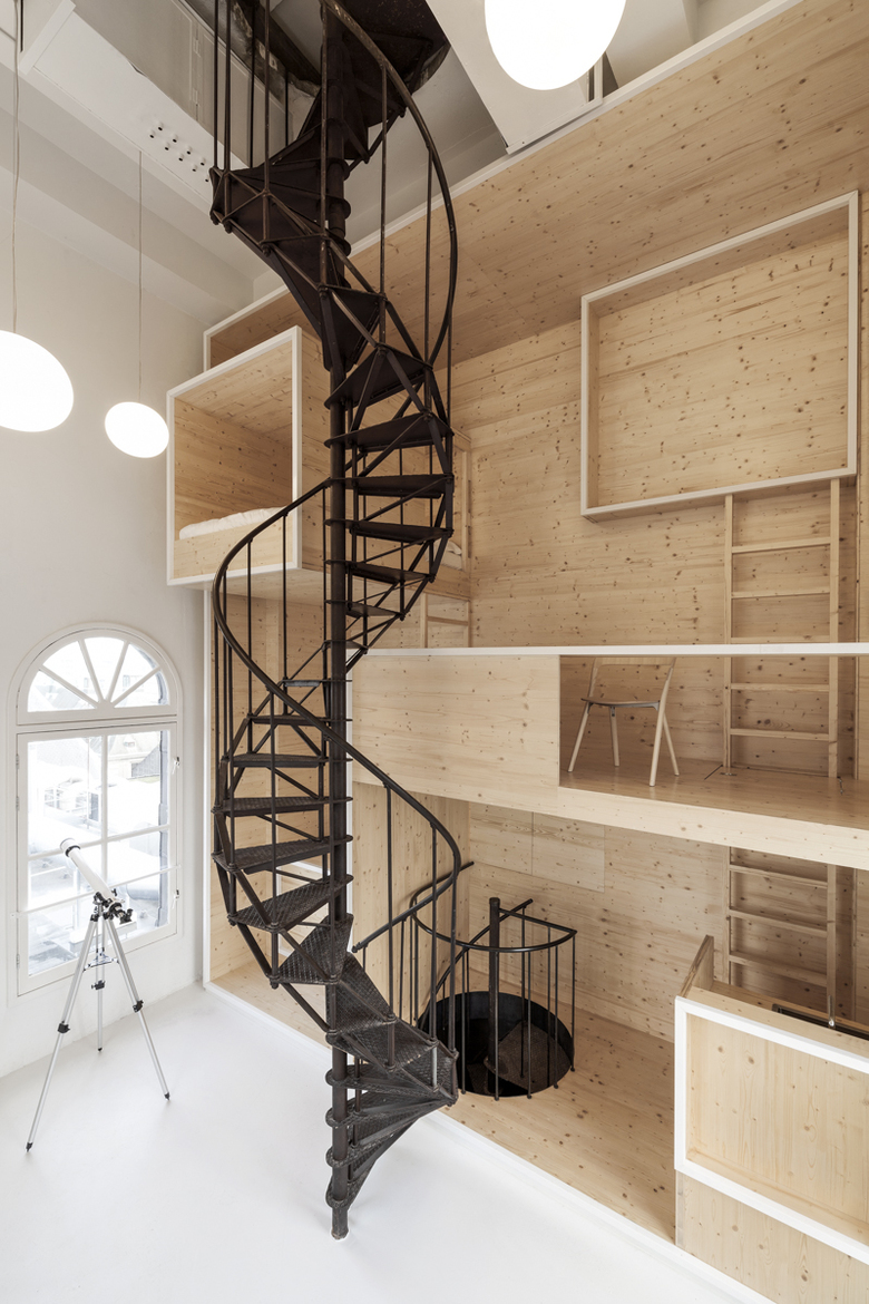 The interior of the tower is designed by i29 interior architects. Room On The Roof wants to offer the artist a unique experience. This was the starting point for i29 to realize an installation that brings together two worlds in one space; playing with scale and perception as in the universe of ‘Alice in Wonderland’. On one side a vertical installation of wooden volumes from floor to ceiling is placed, the other side is a full white space. The wooden installation includes a pantry, storage, desk and daybed. The functions have been stacked on top of each other as a kind of ‘living cabinet’ in order to experience the tower on different levels. Via small ladders you can climb up in the cabinet. Each level gives a new perspective and view to the outside world. All accessories like a telescope, armchair and lamps, are just like the space itself all white to make a contrast with the wooden volume. The monumental spiral stairs leading to the cupola has been restored and adds to the fairytale-like atmosphere.
