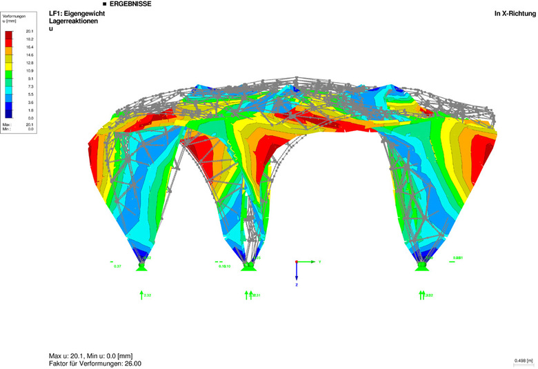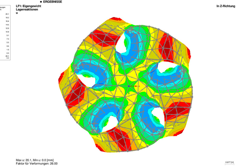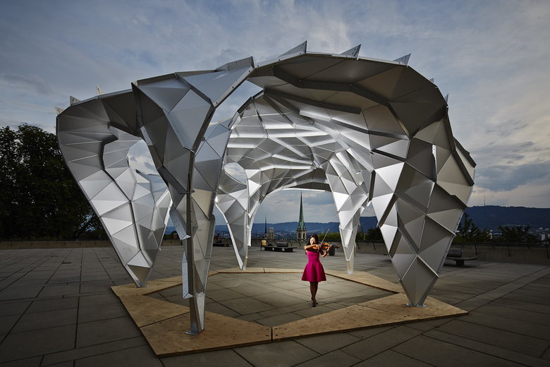 The structure of the pavilion is divided into five main load-bearing parts, merging harmoniously with each other: the dome and the columns. Curved metal sheets are welded together or connected by screws and rivets.