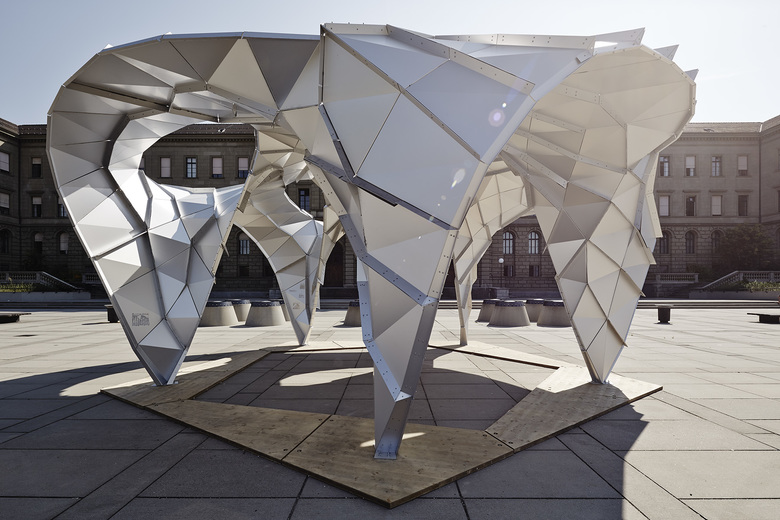 The pavilion has high performance compo- nents because of the automation of the de- sign cycle and manufacturing process. This is the result of architectural design being integrated with the use of robots in an innovative way which makes production purely mechanical.