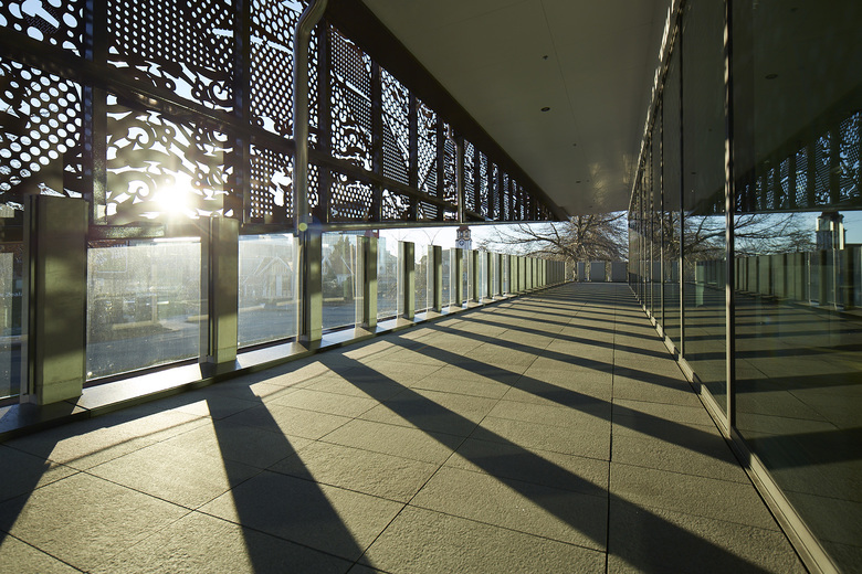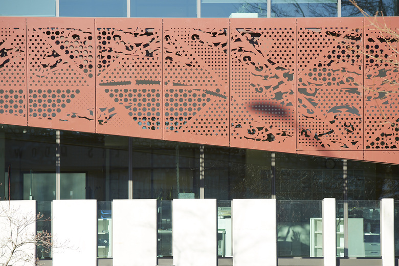 The architects originally took inspiration for the shape of the screen from various forms of Taonga (treasured things). When the initial drafts of the building were presented to the iwi representatives however, it was their identification of the shape as belonging to a Korowai, the Māori Ceremonial cloak that was the most compelling. Just as a Korowai drapes and protects its wearer, so too the screen drapes and protects the building, just as in turn, the Police protect the community.