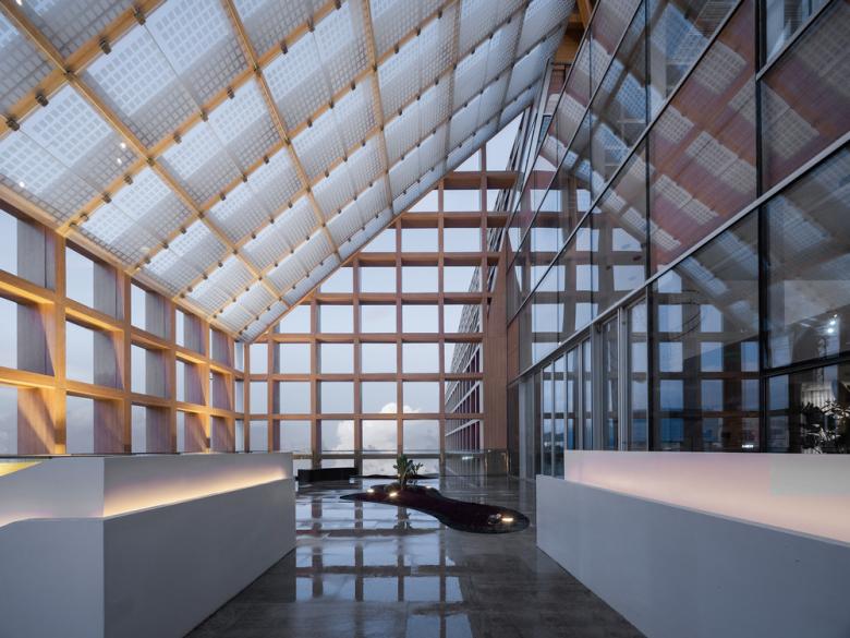 Third, enhanced the comfort level of outdoor space. The 800-mm-deep roof grid structure reduces the sunlight absorption by 70%. It provides a shelter for the outdoor platform, and at the same time ensures natural ventilation and an open view. The grid structure is inspired by the traditional house of Hainan Li nationality, which is a modern performance of the long-established architecture context.