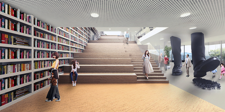 Flexible configuration of community learning space encourages interaction from visitors for participative learning experience. An welcoming open space relates the inside and the outside of architecture closely in both visual association and physical connection by large opening and spans. The master plan provides the two small plots on its north and south which becomes the sustainably paved open space/parking area. West plot became a terraced sculpture and botanical garden, also outdoor space for exhibitions and performances.