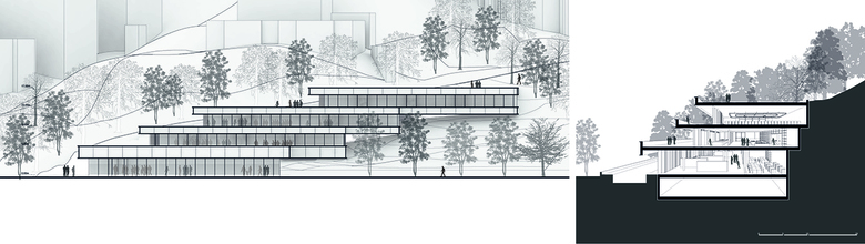 The new Pyeongchang-dong Art Complex of Seoul is conceived as four stacked pavilions, integrated the natural slope of the site; The building becomes the extension of the surrounding green environment. The hilly site integrated volume is introduced in order to minimize the disturbance to the natural environment. The building shows itself from the top in symbiosis with the landscape, becoming a multiple series of green terraces that are easily reachable from the public.