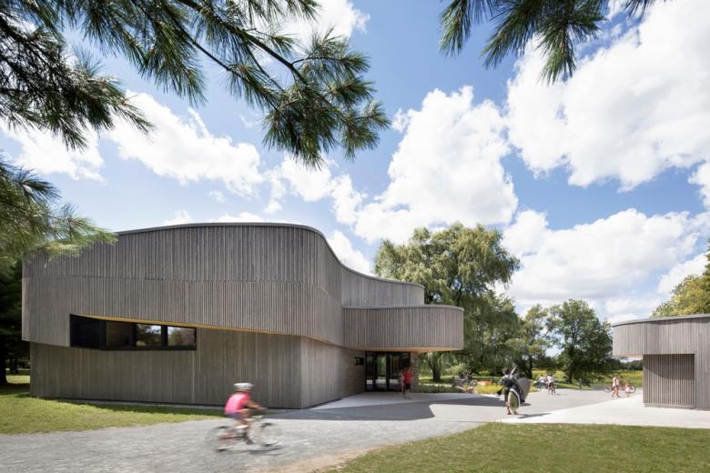 The building's undulated edges were carefully placed to minimize tree cutting, and encourage visitors to wander around and progressively discover the space. The fluid motion is accentuated by a textured veil: a succession of wooden slats overlapping the siding all around the building. This cladding also acts as a light filter and produces shadows dancing across the ground, reminding of the willows’ foliage. Inside, a curvy channel-like recess on the ceiling and a skylight bring in natural light and enhances natural ventilation. The architectural composition is all tied-in together by a glass curtain wall which offers direct views of the parks from the inside and reflecting nature on the tainted glass outside.