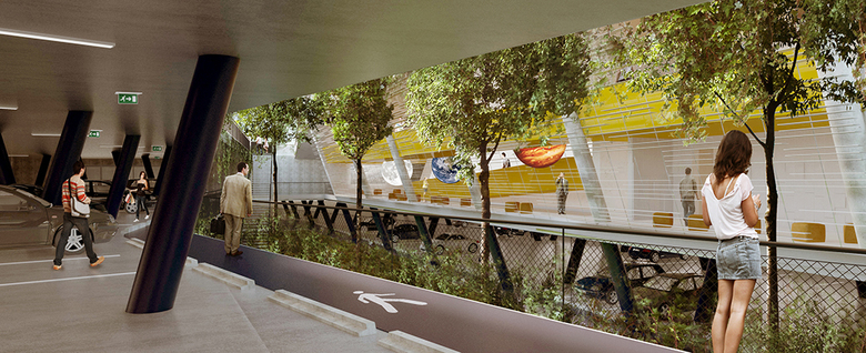 The museum building, for the most part underground as the parking, gives the possibility to maximize the green surface of the park. The exhibition areas inside are organized in two main parts: the introduction ramp at the entrance and a large open space area for multimedia exhibitions.