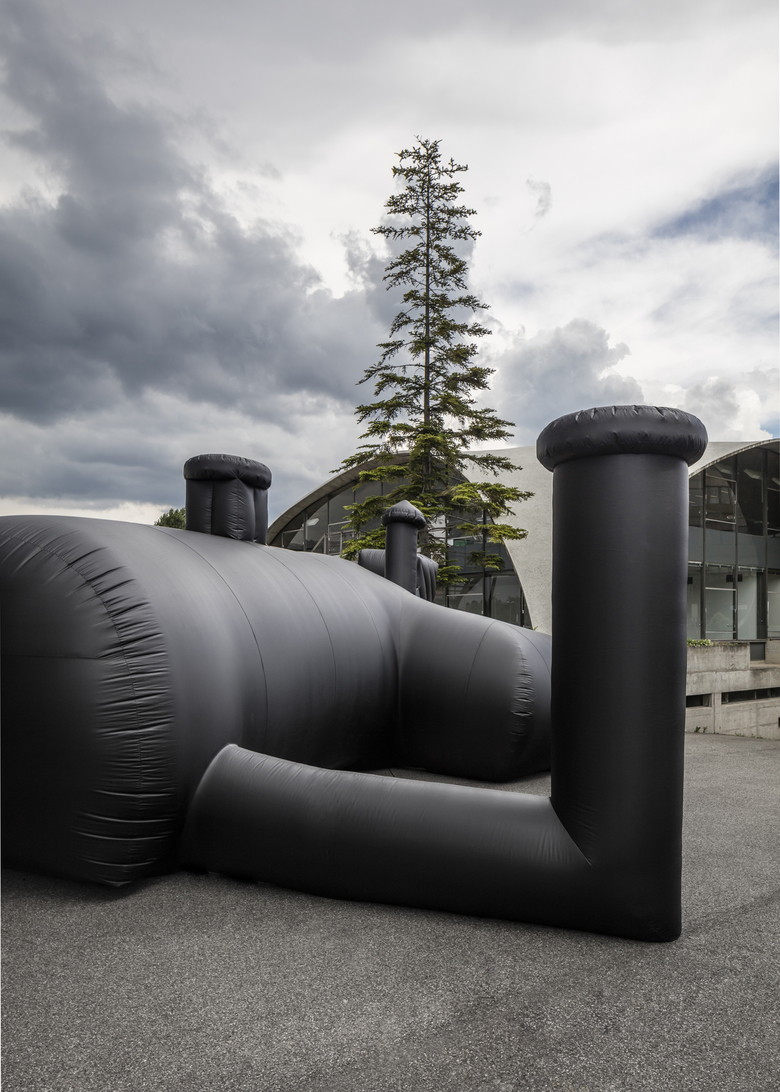 The temporary shelter installation is a dark inflatable bar with a DJ. The whole structure as well as the interior furniture is made out of black PVC membrane. When the party is over the installation is deflated and transported to another location.