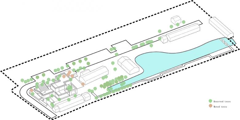 The relationship between building and trees is emphasized in the design. The architects tried to preserve most of existing trees. The building is supposed to "grow up" among the trees.
