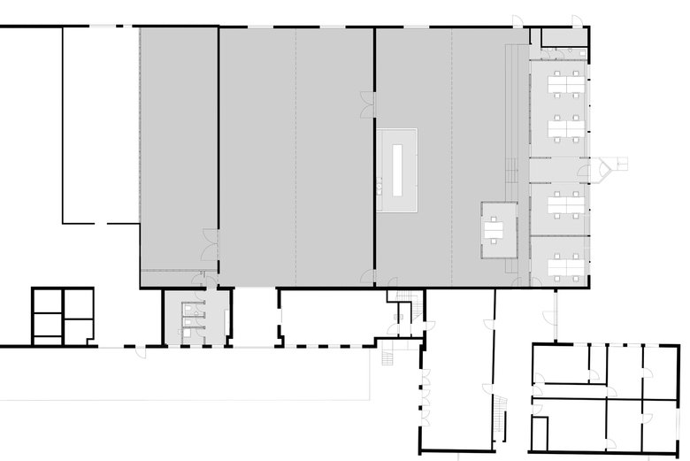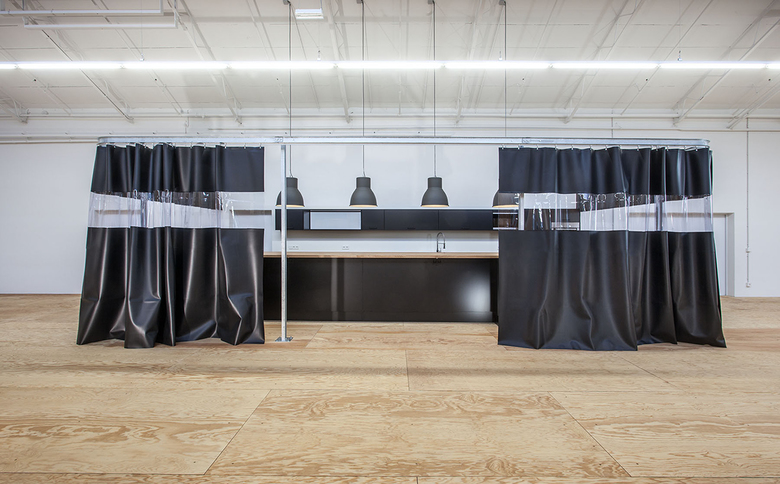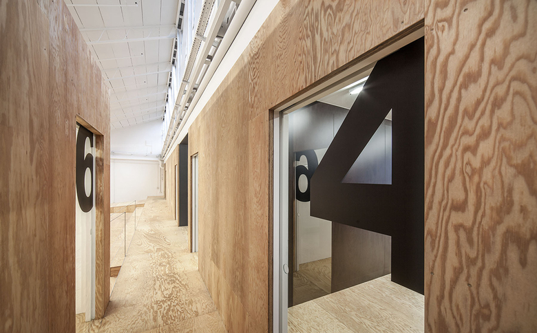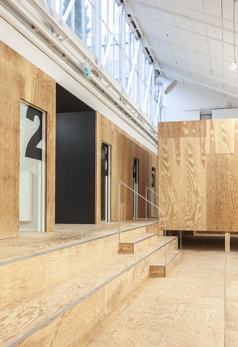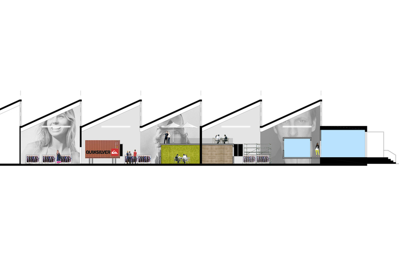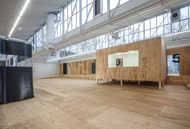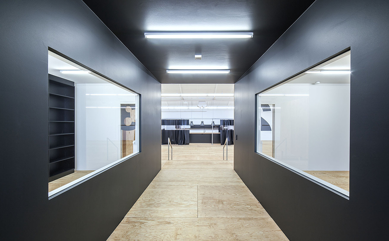 The palette of materials will be kept neutral and desaturated, to allow the colors of the clothes themselves to be the main focus in the space. Plywood elements will create warmth and the white walls will accentuate the quality of light from the sawtooth clerestory windows.