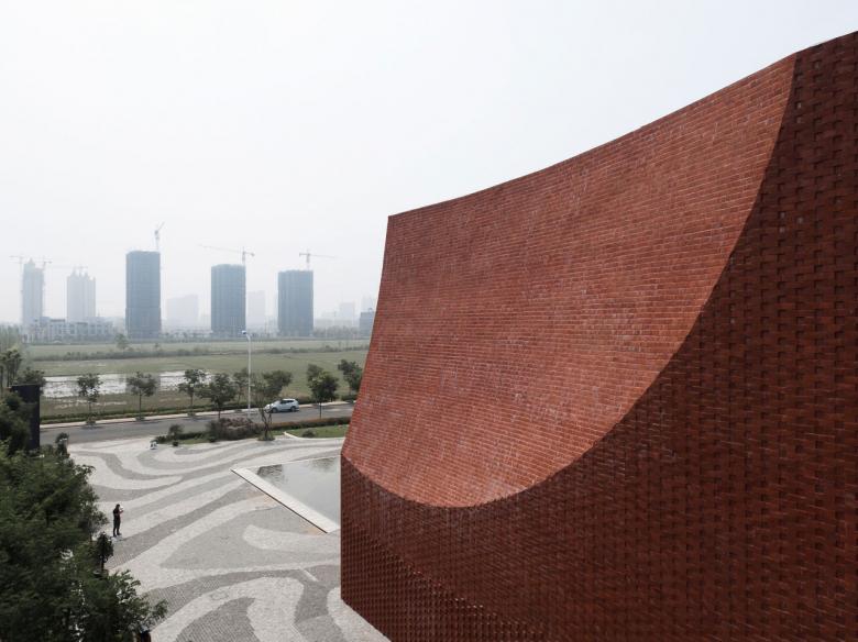 The largest exhibition hall along the street has the red-bricked exterior wall, like a condensed seal printed on the elegant scroll of ink and wash. The way of cutting the corner through the arc surface strengthens the iconic character of the building along the street, forming a unique lasting appeal. Red brick is Yixing clay brick, adopting three kinds of lining according to the different locations. The lower brick head outstand the wall, and the upper part intrudes the wall, and cut part is flatly lined, forming different textures.