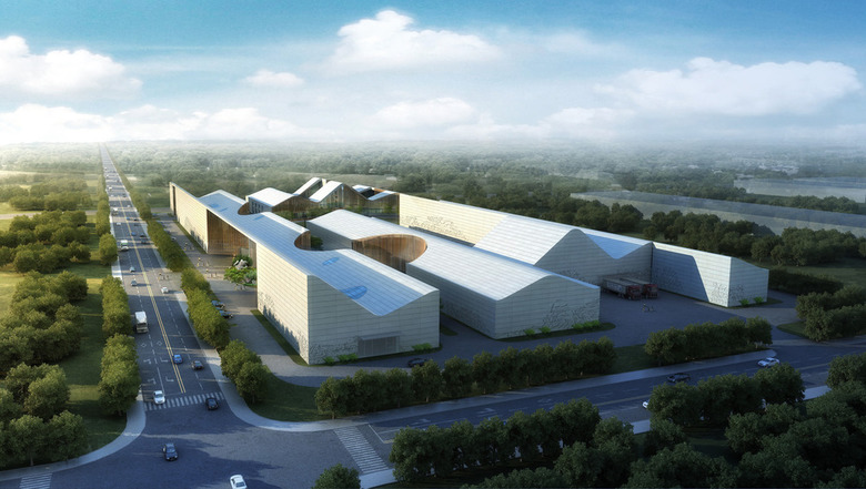 By extruding the section of a typical 3-nave warehouse across the length of the site, a continuous, undulating roofscape is formed that stretches across all function areas. Rather than re-starting the pitch at the eaves of each nave, the roof “oscillates” like a frequency curve, thus creating both pitched and butterfly-shaped roofs, with peaks at different heights. As the valleys of the curve coincide with the gutters of the naves, the roofs are curved slightly upwards towards the eaves, resembling a traditional Sichuan-style roof.