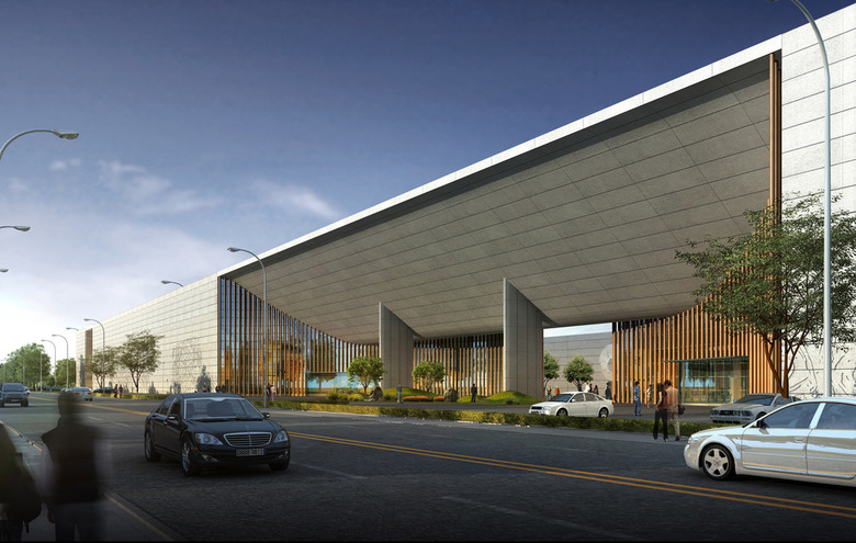 The biggest courtyard, the oval “central plaza”, is a garden surrounding a central lawn, which will be used for open-air shows and screenings, and to host events. It creates a buffer zone between hotel and factory, which absorbs the noise and dust from the production. A second oval courtyard is placed between the southern and the central nave, and “balances” the central plaza diagonally across. It accommodates a sculpture garden, for tall glass and other sculptures. The third oval virtually extends across the site boundary, and carves the monumental 80m-wide, representative main entrance. The three ovals are rotated against each other with their long axis, so as to relate to and communicate with each other. A fourth, rectangular courtyard serves as the semi-private garden of the hotel.