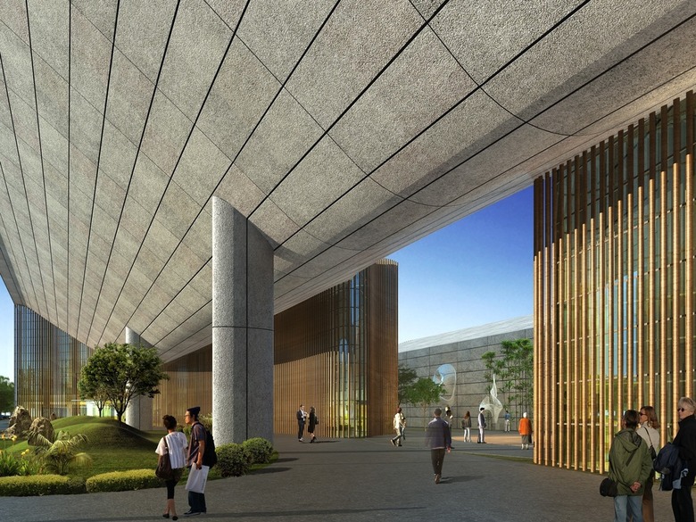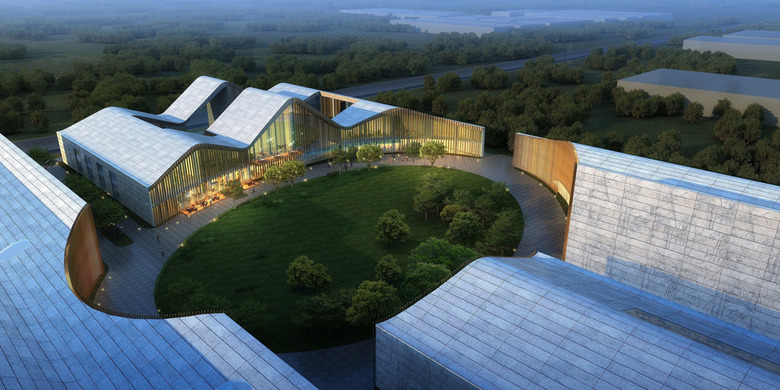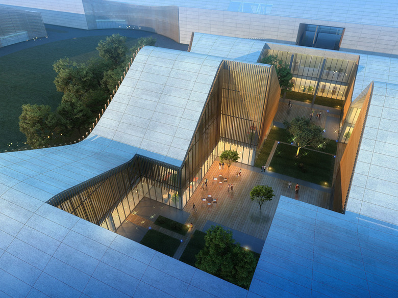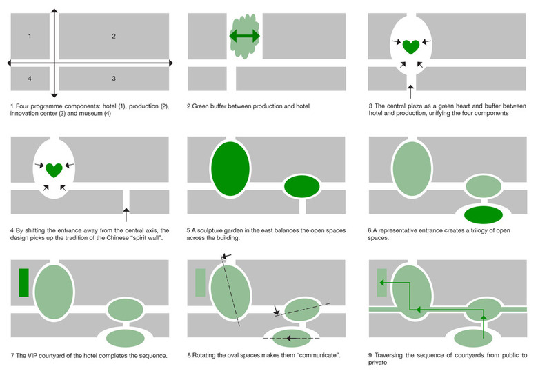As a further feature of traditional Chinese architecture, and to protect the buildings from their harsh industrial surroundings, the architects drew on an introverted courtyard typology. The series of naves is punctured by four courtyards, each one with an individual character and serving a different purpose.