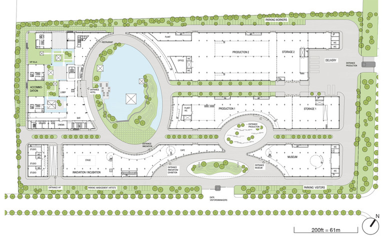 The brief comprised five components: production facilities, a sales- and auction hall, a small museum, individual studios for artists and a boutique hotel for VIP clients and guests who wish to stay overnight.