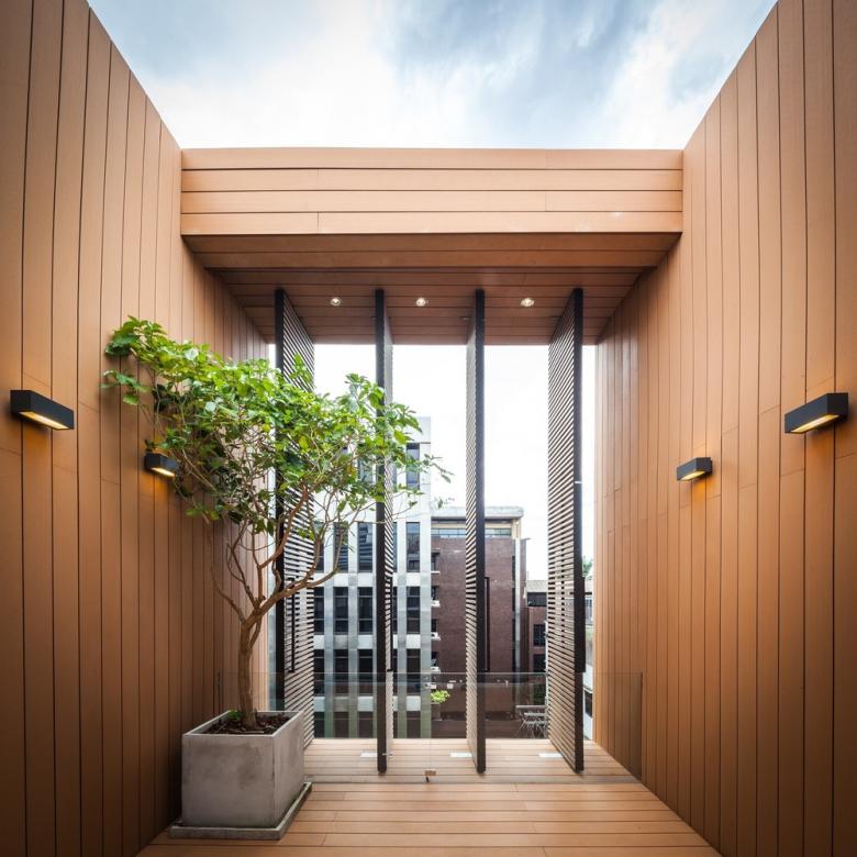 To achieve this, all units are double-leveled. Each unit is differently and separately accessed by the elevator which is set at the back of the building. The top level is the main living room and dining room for the family. In the middle situate the residential units while the jewelry office is at the ground floor. Also, a big tree is added in the house to provide a feeling of nature. The exterior was designed reflectively to the area of units inside, as well as the connection of units to each other and to the top level.