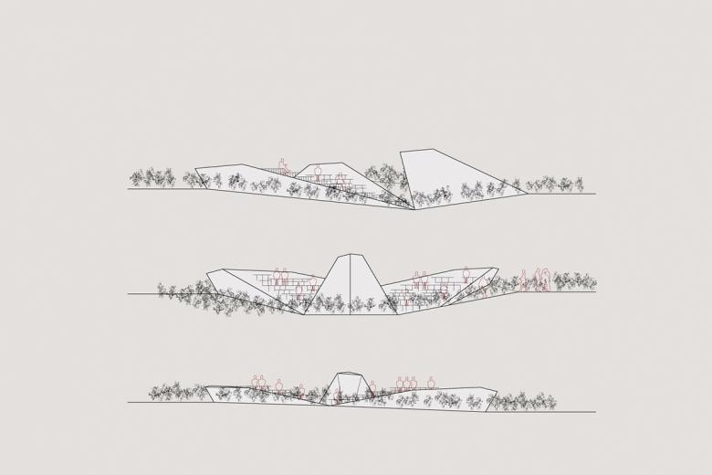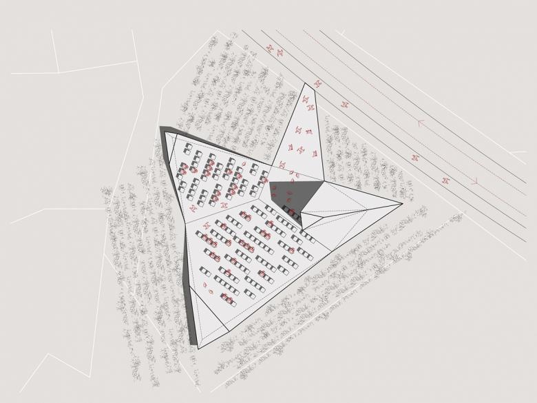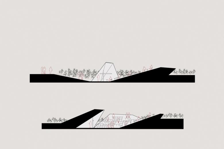 The first step in defining the space is the siting of the triangular surface of the new square in the center of the vacant plot. The paved surface, clearly separate from the grassy surroundings, defines the future socializing space. The surface then employs a narrow access path to connect to the road passing by. The central part, created by the section of the geometries of both paved surfaces, is given a slight dip, which shelters the event space from the impacts of the surroundings and directs all users' gazes towards the center. Next, the volumes of the chapel and the grandstands are raised to create an introverted village square. The final device in designing the new village square is the truncation of the raised volumes by means of a uniform plane which creates an impression of a virtual roof and completes the structure's form.