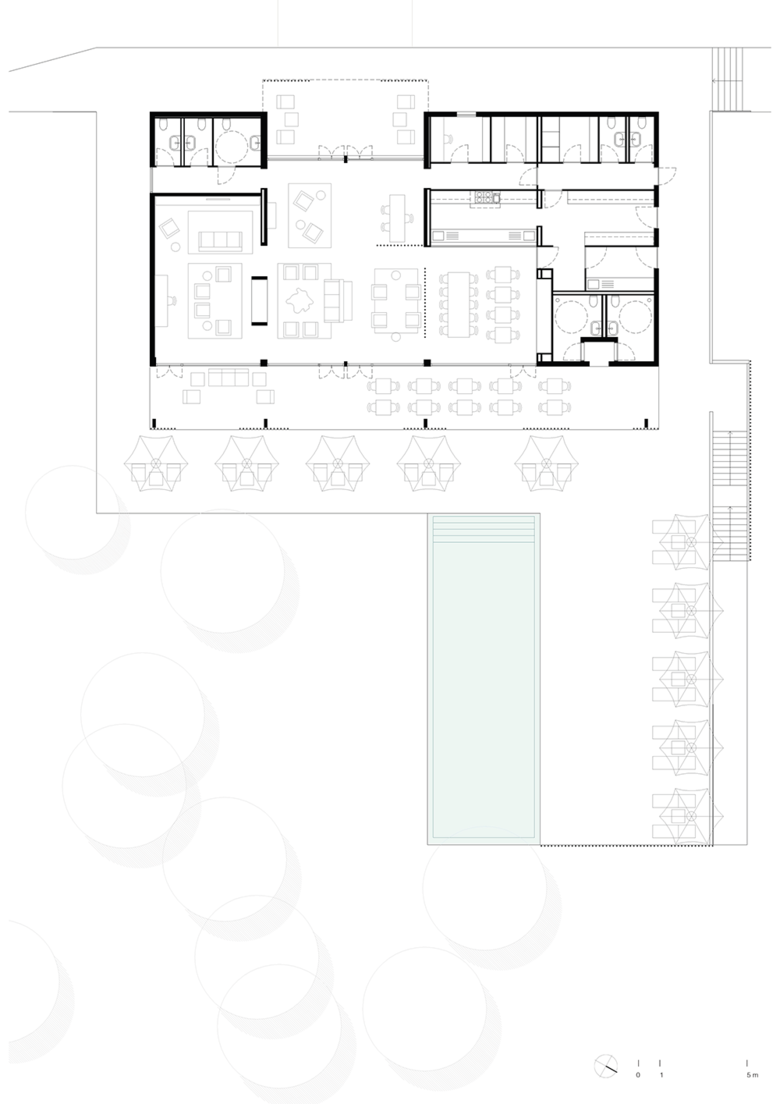 The largest volume contains the entrance and reception and also a set of public and lounge areas. Smaller volumes include staff facilities, technical, storage and service areas. The remaining 5 volumes of approximately equivalent size, features 22 rooms and 2 suites, all