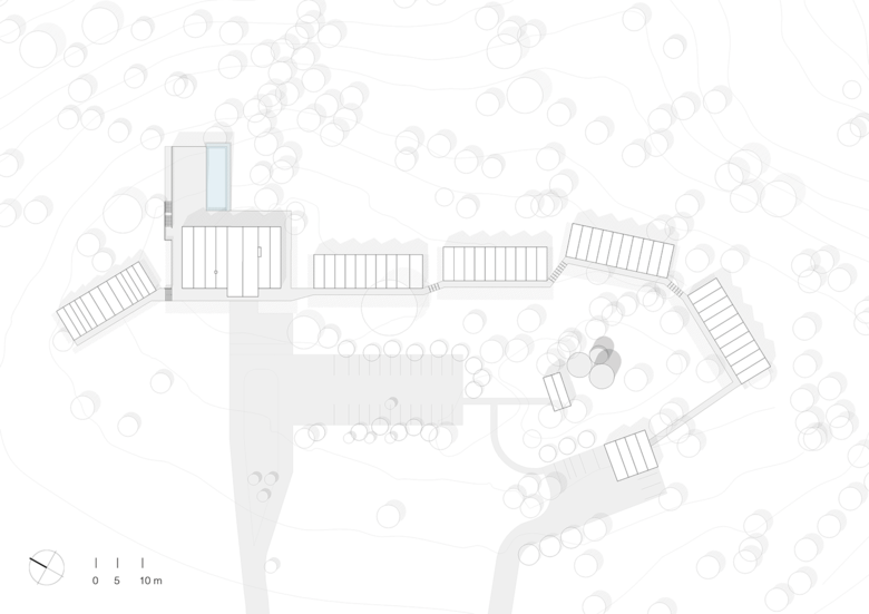 The arrangement of the existing trees on the implantation site led to dividing it into several modules among the trees, preserving and protecting the forest heritage, while taking advantage of this unique nature setting.