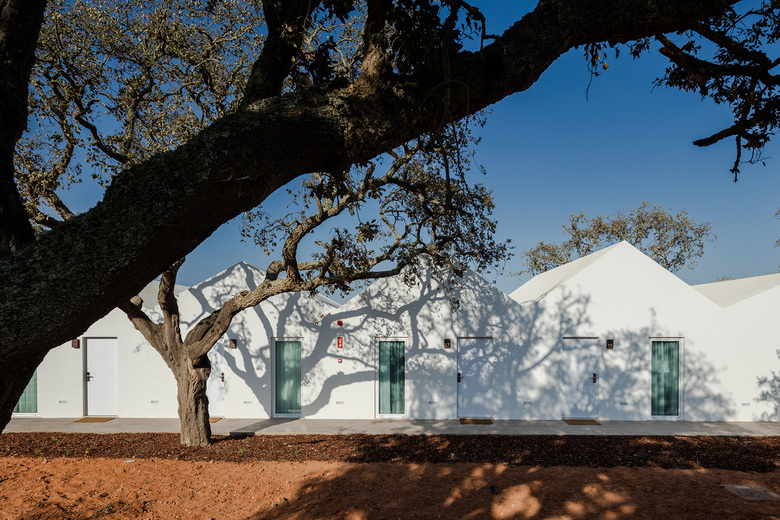 Each building is preceded and framed by a bushy strip, which follows the entire footpath access to rooms, exacerbating the mutability of the landscape through the different expressions which it assumes throughout the year. The definition of planted areas has been reduced to the essentials - minimizing the use of irrigation and maintenance - leaving centre stage to the cork oak forest.