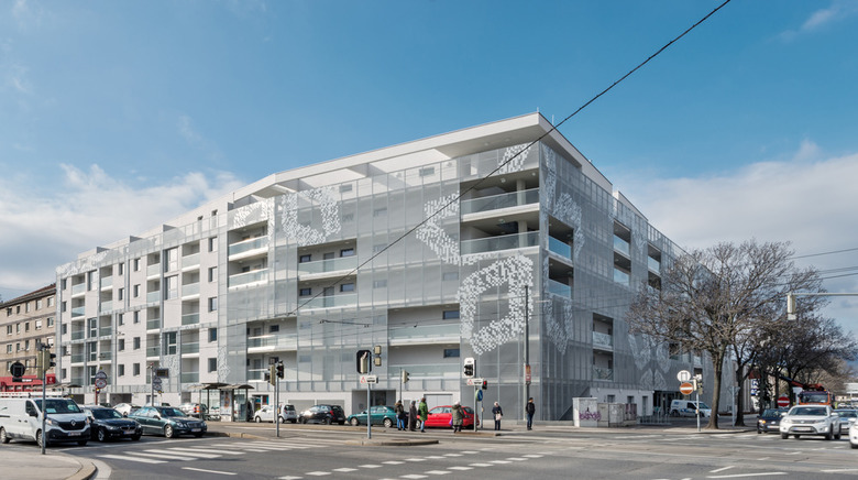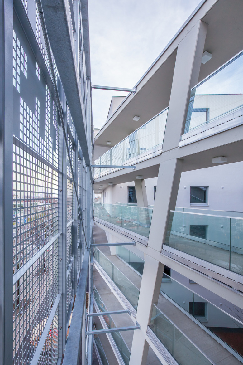 The property is located on a very busy intersection. An intervention in the existing building use class made possible better light and sun exposure conditions. In order to defuse the “T”-point, a V-shaped courtyard has been cut into the building. The paths to the access balcony and the ancillary areas are concentrated around the courtyard.