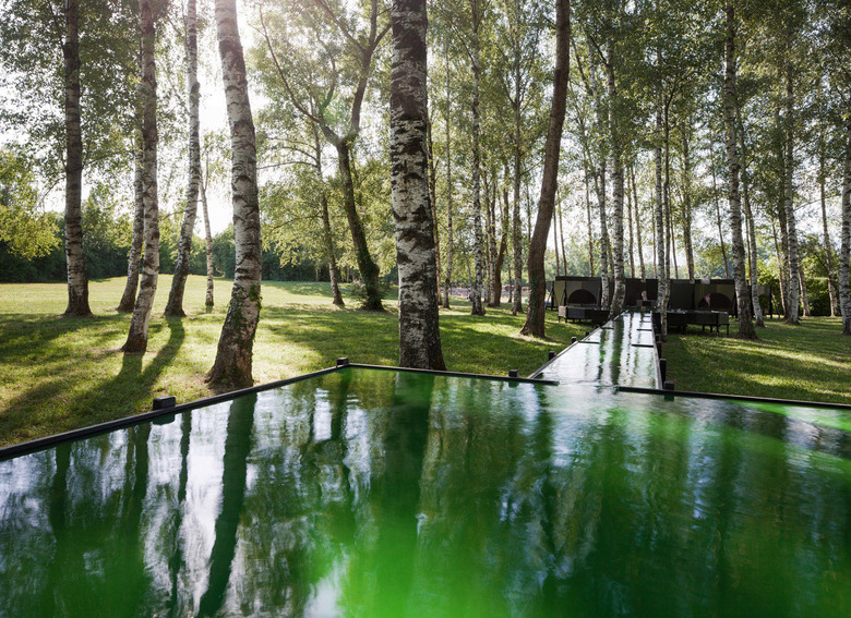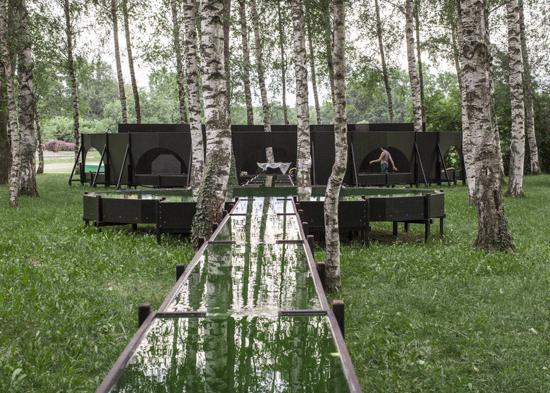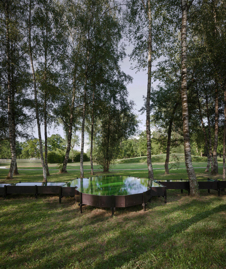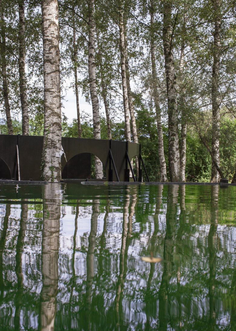 In the culture of the picturesque and romanticism, the folly pavilions referred and sometimes quoted built and natural phenomena to compose their architecture. Scales and forms were deformed, adapted freely to articulate the views of specific landscape compositions. The Spirulina Fountain, similarly, is installed in a birch forest located in a public park of Geneva and dialogues with the context and historical references as a much as it generates food. It functions both as a garden folly and a spirulina production center.