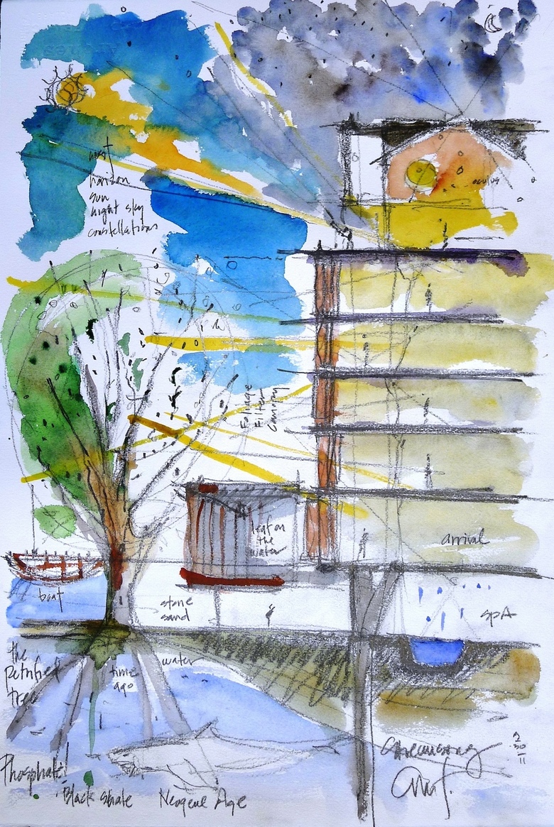 Alfonso designed a vertical building strategy for the lodge grounded in the pre-historic terrain. Four zones – Submersion (AquaPietra spa, Breezeway, SottoTerra fine dining), Bank (public spaces and the Leaf lobby), Canopy (216 guest rooms with custom floor to ceiling wood louvers, furnishings, paintings, bookshelves), and Sky (Fragmentary Blue rooftop lounge inspired by the Robert Frost poem) – represent a natural correlation to the unique characteristics of landscape and climate.