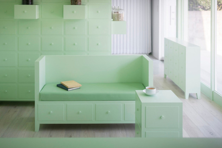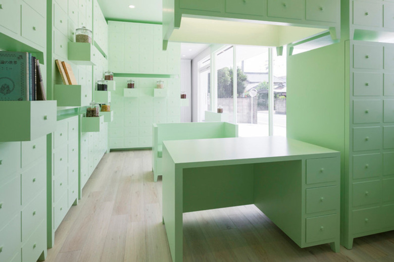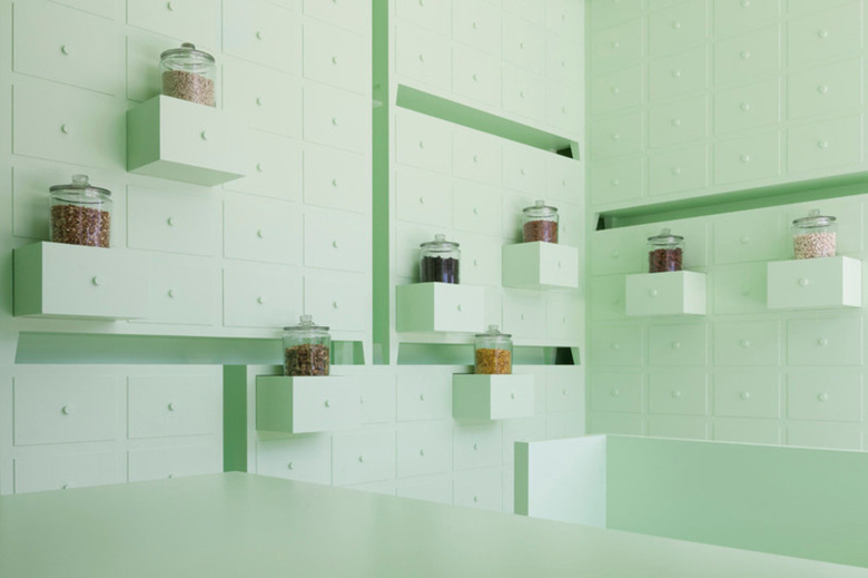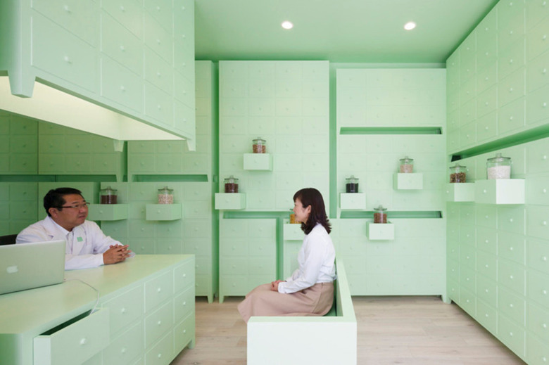 The space painted in mint green color freshly expresses a world of herbal medicine which is derived from plants. The soft color is intended to create curiously ambivalent atmosphere that heaviness and lightness of furniture coexist.