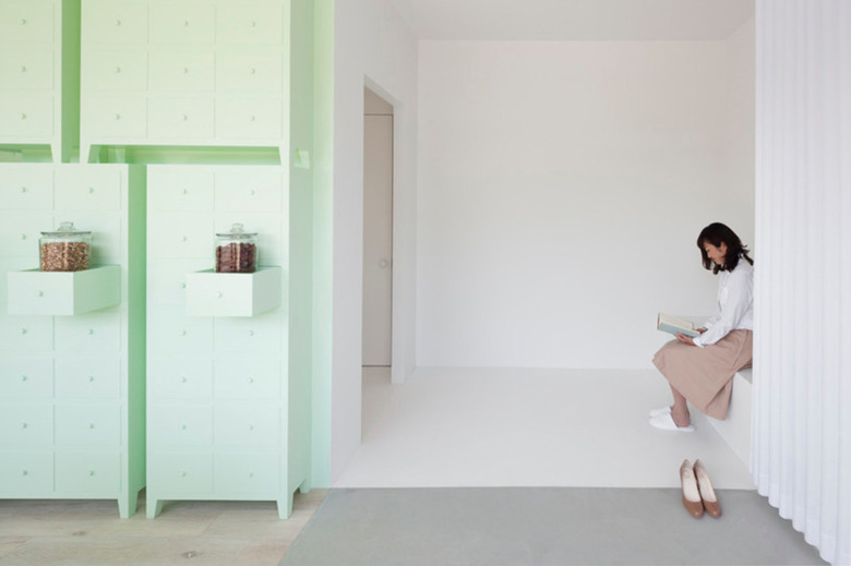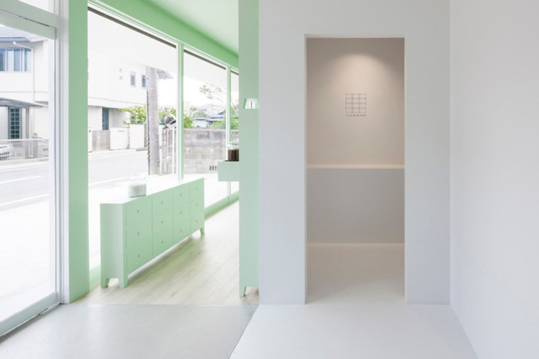 Taking advantage of its wide opening frame, the place was intended to be looked like a large show window. Kampo lounge in mint green and clinic for acupuncture and moxibustion in white is clearly separated by a waiting room. It expressly tells that one building has two spaces for each different purpose.