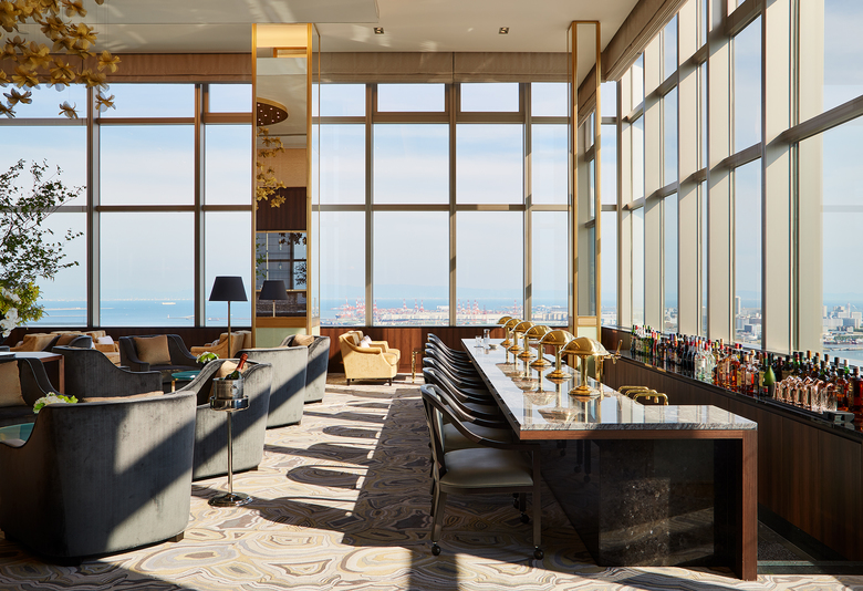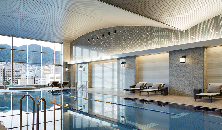 On the 6th floor, there is a rooftop pool, and ofuro tubs for men and women. Here one is close to the city views yet high enough to enjoy the privacy and serenity of a luxurious spa environment. At the top of the tower are the 34th floor and 35th floor dining and lounge spaces, where dark wood, luxurious stone, rich colors and expansive windows create a dramatic frame for the views of city, sea and mountains. The graceful and elegant spaces combined with the varied landscapes below offer residents an amazing level of comfort and opportunity.