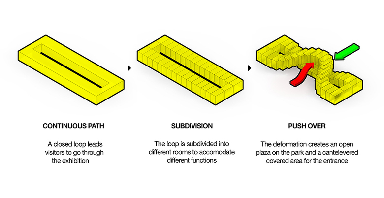 The courtyard building, which works as a path for visiting the exhibition, is taken into consideration as a starting point and then deformed pushing one side on the other.