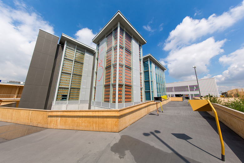 The idea isn’t just stated. The big gimmick of the pavilion is that it is demonstrated through architecture. As the stock in each silo diminishes, the floor on which visitors walk through that silo is lowered. Accordingly, it will be possible for visitors later in the six-month run of the fair to reach shelves lower in the building, and for passers-by to see the empty shelves in the upper reaches of the glass-walled silos. If that isn’t enough of an engineering feat, the elevators, by Schindler, had to be set to deliver visitors at different points as the floor levels change. It will be interesting to see the pavilion later this summer, when the top shelves are empty, and the floors are closer to the ground.