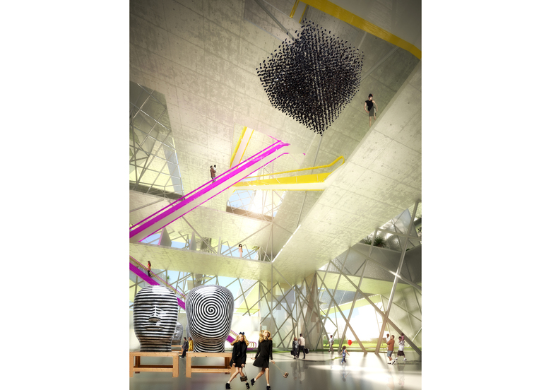 The two main functions provide spaces independent from each other while sharing the great lobby at the ground floor, that can also be used as a special exhibition space – an impressive 1500 sqm area with a maximum 24.5 m height.