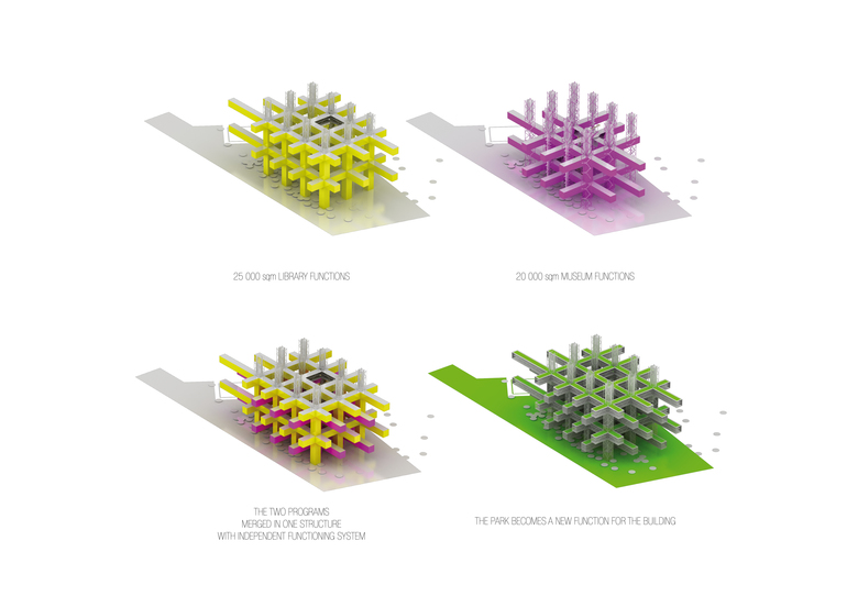 The building combines the requested library and museum functions with a third one of equal importance: the park – creating an unique, complex public space, offering a diverse and layered spatial experience.