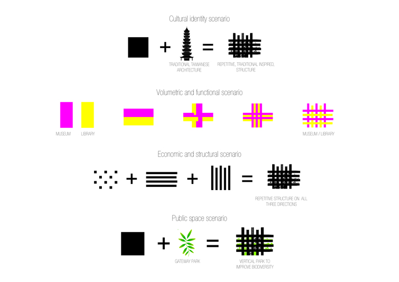 The site is located on the northern end of Taichung Gateway Park. The project integrates the park landscape to form a key cultural landmark and an entryway gesture into the park. In such a complex environment we proposed a light structure, having as a key concept the idea of PERMEABILITY, a complex urban space hosting the museum and the public library programs.